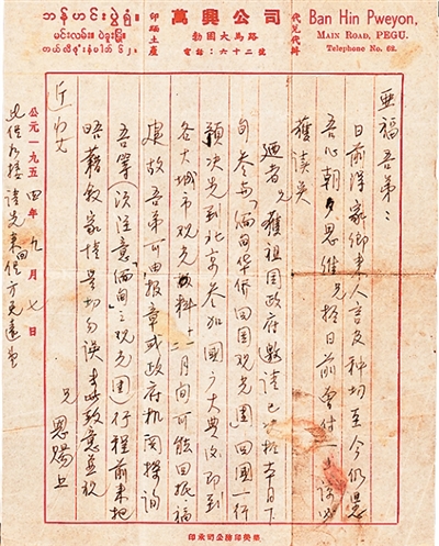廼者兄獲祖國政府邀請,已決于本月下旬參與“緬甸華僑回國觀光團”回國一行,預(yù)決先到北京參加國慶大典,后即到各大城市觀光,料十一二月間可能回抵福建,故吾弟可由報章或政府機關(guān)探詢吾等(須注意“緬甸”之觀光團)行程,前來把晤,藉敘家情,是切勿誤。