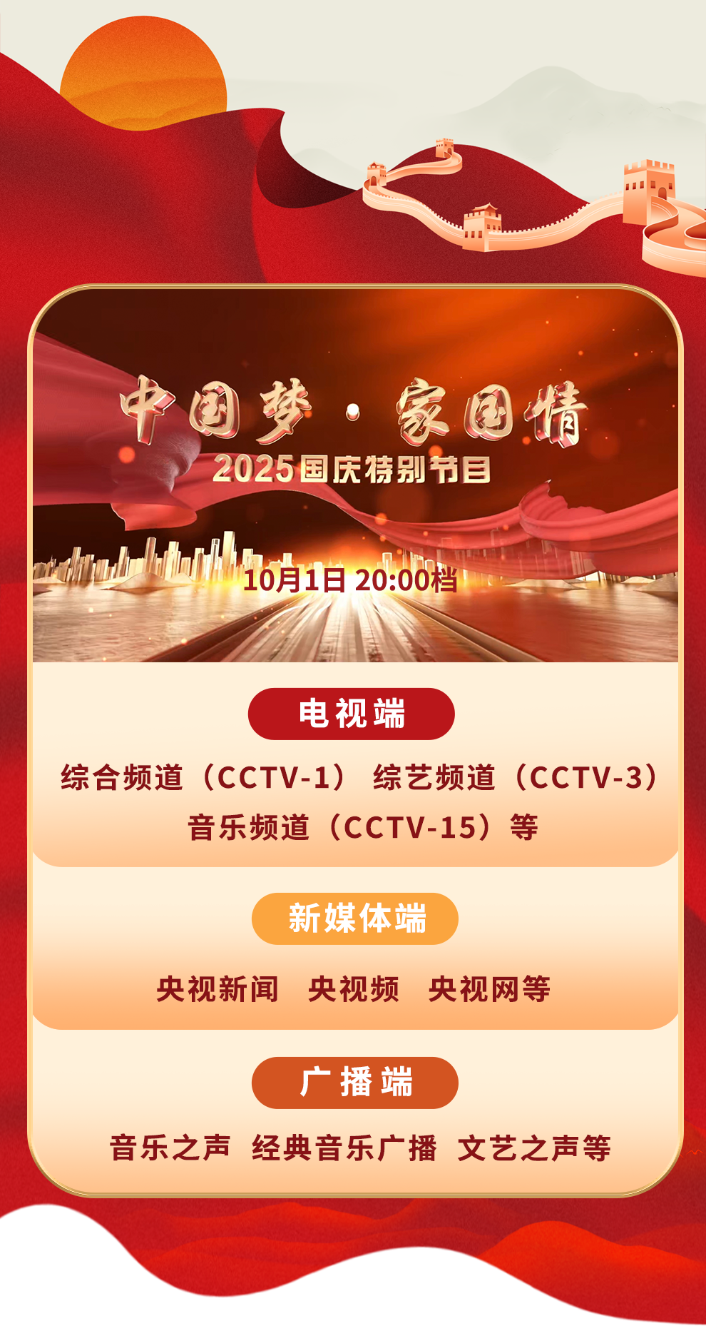 金秋潑彩山河醉,家國同輝氣象新。10月1日晚八點,《中國夢 家國情——2025國慶特別節(jié)目》將在《我愛你中國》的大合唱中拉開大幕。特別節(jié)目走進(jìn)城市地標(biāo)與文化遺址,展現(xiàn)山河新貌與奮斗者群像。經(jīng)典曲目、交響合唱、新創(chuàng)歌曲傳遞濃濃家國情懷??箲?zhàn)老兵、奧運冠軍、各行各業(yè)奮斗者深情講述……整場節(jié)目,洋溢著中華民族偉大復(fù)興勢不可擋的壯志豪情。