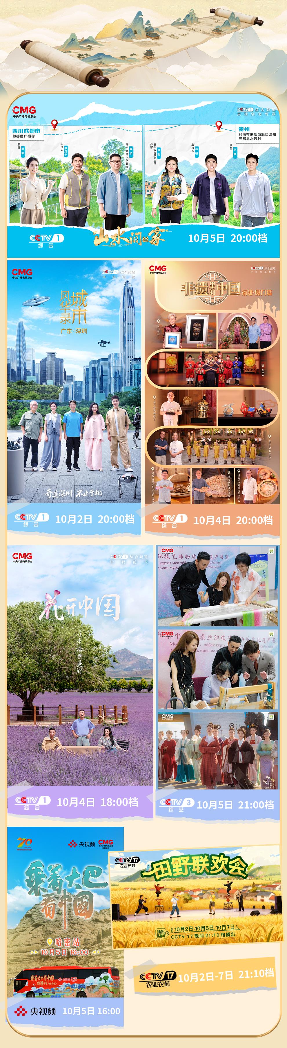 八天假期,想好去哪兒玩了嗎?來,跟著總臺去打卡!頭兩站:四川、貴州!《山水間的家(第四季)》“山水小分隊”邀你在川西林盤探韭香產(chǎn)業(yè),在黔南山鄉(xiāng)看巖椒成林。第三站:廣東。《城市風(fēng)華錄》帶你去深圳探訪全球首家機(jī)器人6S店,感受“奇跡之城”向新向好的澎湃動力。第四站:福建。珠繡、漆線雕、閩南童謠、高甲戲……看《非遺里的中國》,領(lǐng)略廈門非遺之美。第五站:新疆。從《花開中國》開啟一場跨越天山的芬芳之旅,在《衣錦天下 絲路季》發(fā)現(xiàn)絲綢之路上的中國審美,《乘著大巴游中國》探尋哈密甜美密碼。第六站:內(nèi)蒙古。在通遼參加《田野聯(lián)歡會》,體驗鄉(xiāng)土文化新活力。這八天的旅程,你不會錯過雄奇的風(fēng)光、古老的文化、新奇的創(chuàng)造,還有熱氣騰騰的生活。