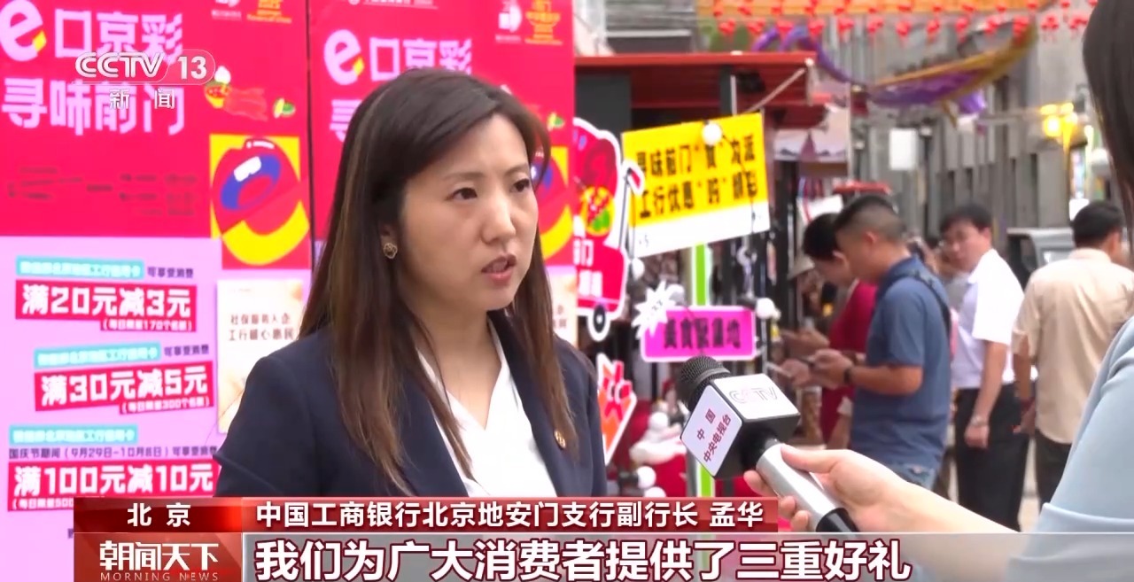 中國工商銀行北京地安門支行副行長(zhǎng) 孟華:我們?yōu)閺V大消費(fèi)者提供了三重好禮,除了傳統(tǒng)的消費(fèi)滿減活動(dòng)以外,我們還疊加了數(shù)字人民幣的優(yōu)惠支付,同時(shí)還設(shè)計(jì)了數(shù)字人民幣的打卡活動(dòng)。
