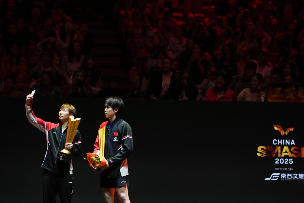 10月5日,男單冠軍王楚欽(右)和女單冠軍王曼昱在頒獎(jiǎng)儀式上合影。新華社記者 孫非 攝
