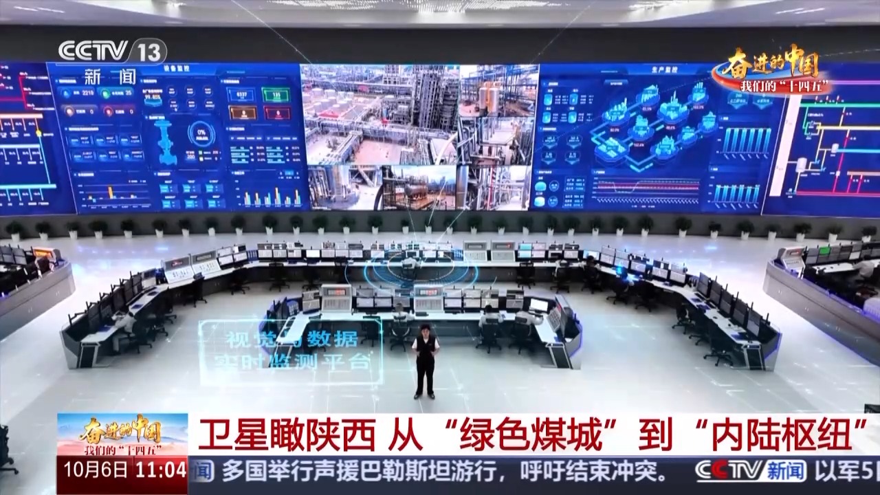 總臺記者 侯瀟揚:像這樣充滿科技感的應(yīng)用,在榆林化學(xué)還有很多。我身后的這塊大屏幕就是榆林化學(xué)的“工業(yè)大腦”。在我的左手邊是生產(chǎn)監(jiān)控系統(tǒng),右手邊是設(shè)備監(jiān)控系統(tǒng)。中間則是各廠區(qū)的視覺與數(shù)據(jù)實時監(jiān)測平臺,海量的信息實時傳輸回“中樞神經(jīng)”,離不開通信技術(shù)的深度參與。