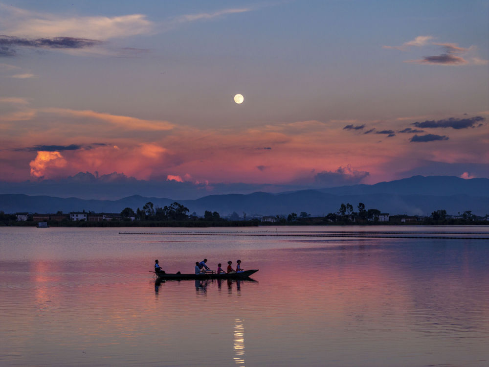 10月6日,人們乘船在云南大理洱源西湖賞月(無人機照片)。新華社發(fā)(羅新才攝)