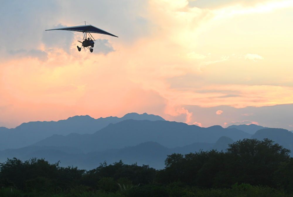 10月6日,游客在浙江省金華市武義縣大斗山飛行營地乘坐動力三角翼。新華社發(fā)(張建成攝)
