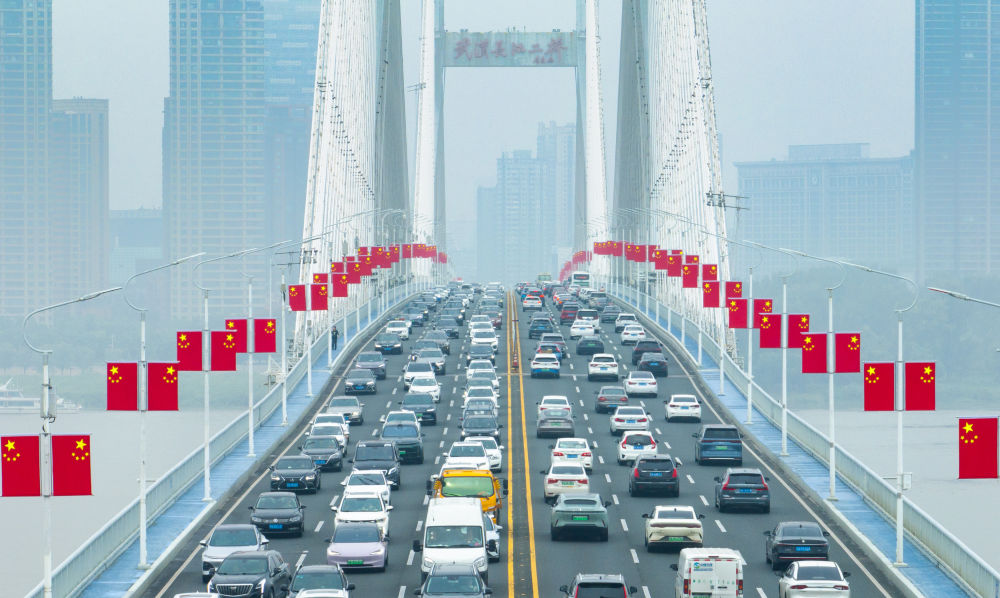 國慶假期第一天,各地迎來出行高峰。這是車輛行駛在湖北省武漢長江二橋上(無人機照片,10月1日攝)。新華社記者 肖藝九 攝