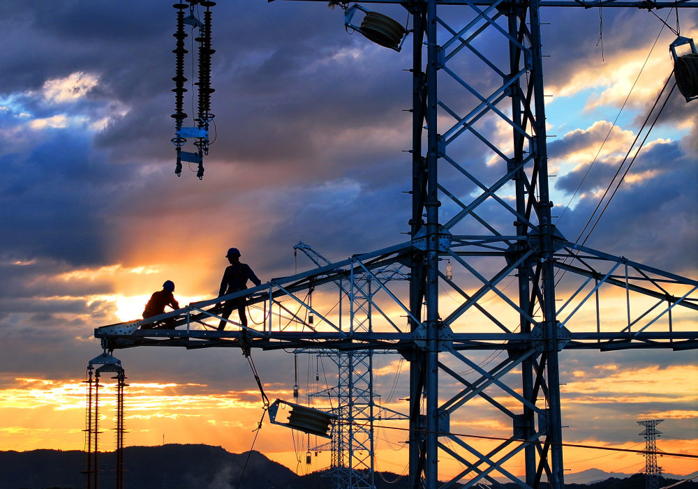 10月6日,在湖南省衡陽市雁峰區(qū)南三環(huán)路上,湖南雁能建設集團有限公司的施工人員在高塔進行架線施工作業(yè)(無人機照片)。新華社發(fā)(曹正平攝)