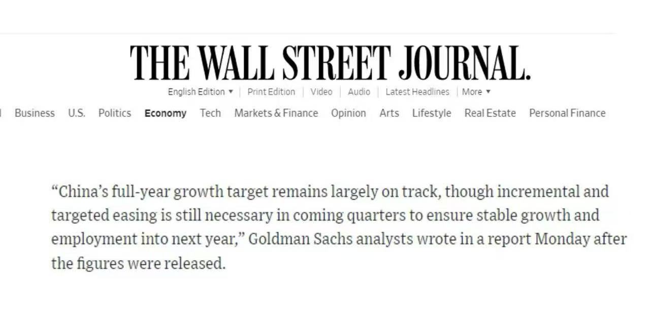 美國《華爾街日報》報道顯示,2023年前三季度中國GDP同比增長5.2%,意味著"5%左右"的年度增長目標(biāo)已基本達(dá)成。報道援引高盛分析師觀點稱,雖然未來幾個季度仍需實施漸進(jìn)式、結(jié)構(gòu)性的寬松政策,但全年經(jīng)濟(jì)增速仍將總體符合預(yù)期。