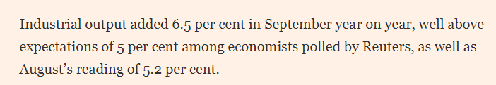 英國《金融時報》的文章分析說,9月規(guī)模以上工業(yè)增加值同比增長6.5%,顯著高于路透社調(diào)查經(jīng)濟(jì)學(xué)家預(yù)期的5%及8月的5.2%。荷蘭國際集團(tuán)(ING)經(jīng)濟(jì)學(xué)家分析稱,超預(yù)期表現(xiàn)主要源于外需拉動。文章說,上周,海關(guān)數(shù)據(jù)顯示,中國出口保持韌性,9月同比增長8.3%,對東南亞等地區(qū)出口持續(xù)增長。