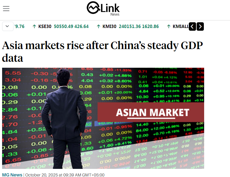 巴基斯坦金融網(wǎng)站Mettis Global Link發(fā)表題為《亞洲股市響應(yīng)中國穩(wěn)健GDP數(shù)據(jù)普漲》的文章。文章分析稱,亞洲市場20日迎來開門紅,得益于中國的最新經(jīng)濟(jì)數(shù)據(jù)。中國第三季度GDP同比增長4.8%,同時維持貸款市場報價利率(LPR)。股市方面,香港恒生指數(shù)大漲逾2%,內(nèi)地滬深300指數(shù)上漲0.74%。日經(jīng)225指數(shù)飆升近3%,首次突破49000點大關(guān),東證指數(shù)上漲2%。