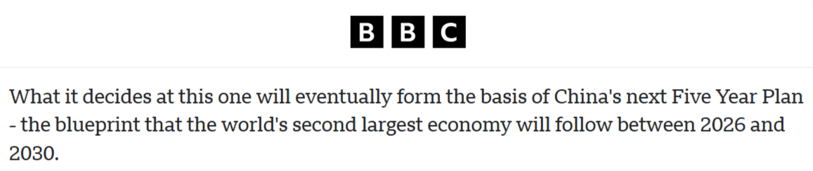 10月20日至23日,黨的二十屆四中全會在北京舉行。對此,英國廣播公司(BBC)19日報道認(rèn)為,“此次會議所作的決定最終將成為中國下一個五年規(guī)劃的基礎(chǔ),而這一規(guī)劃將指引世界第二大經(jīng)濟(jì)體在2026年至2030年期間的發(fā)展方向”。