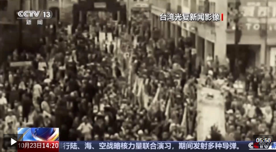 “10月25號,日本代表在臺北中山堂簽字投降。淪陷五十年的臺灣,重回祖國懷抱。萬千的臺灣同胞,再見天日,重獲自由,在街上熱烈慶祝。”