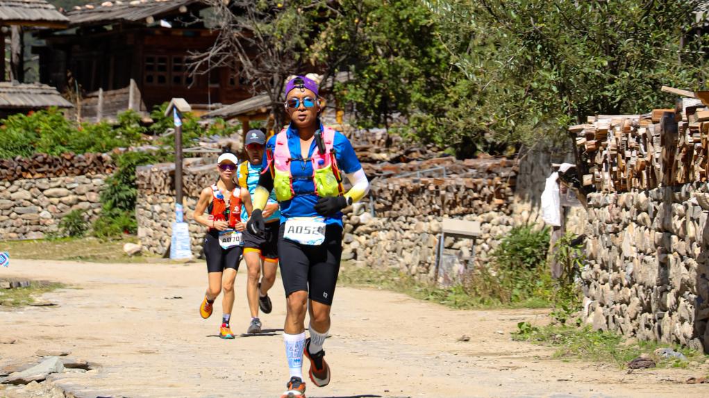 9月27日,首屆巴松措山地越野跑在西藏林芝市工布江達縣巴松措風(fēng)景區(qū)舉行,圖為參賽選手穿過古村落錯高村。新華社記者 格桑朗杰 攝