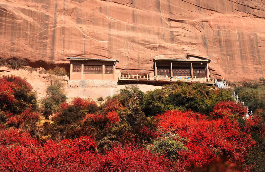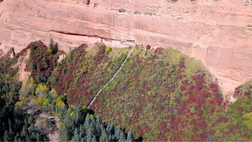 開鑿于紅砂崖壁上的金塔寺石窟,要上去得爬240級臺階