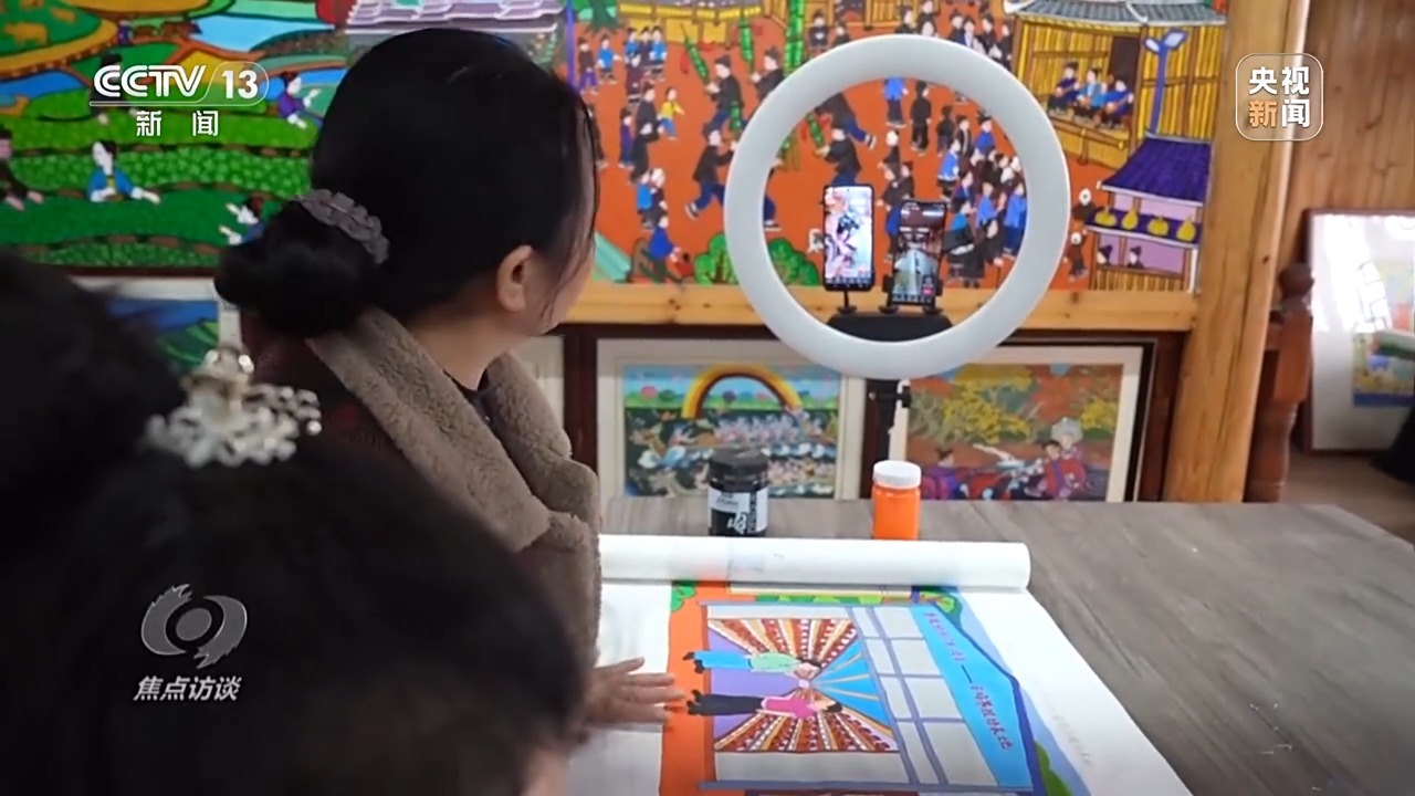 獨(dú)峒鎮(zhèn)是三江農(nóng)民畫的起源地,鎮(zhèn)上的一家侗畫博物館展示著三江農(nóng)民畫的發(fā)展與歷史,還在二樓搭建了創(chuàng)作平臺。過去,不少人有事沒事喜歡在附近聚在一起喝酒、打牌。如今,閑暇時(shí)候,不少附近的村民還會來這里聚集,但吸引他們的卻是繪畫、交流。在二樓平臺,有人還搭起架子,做起繪畫的直播。