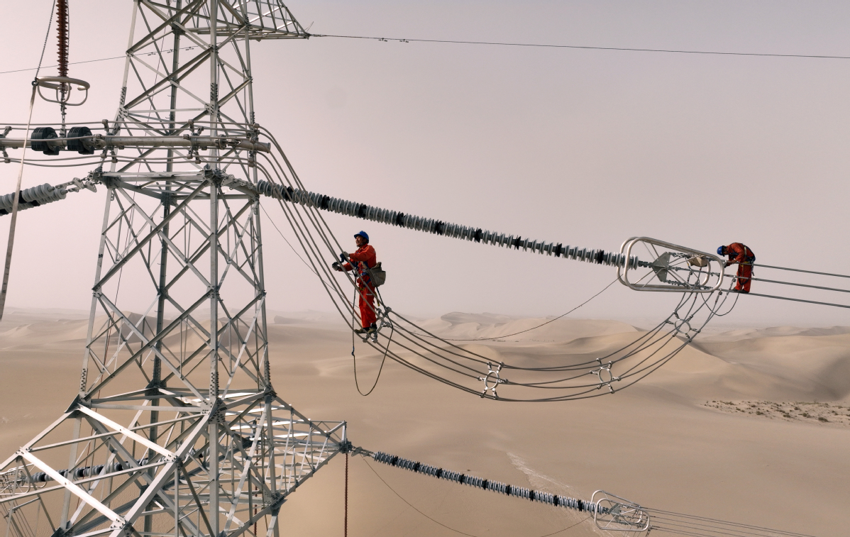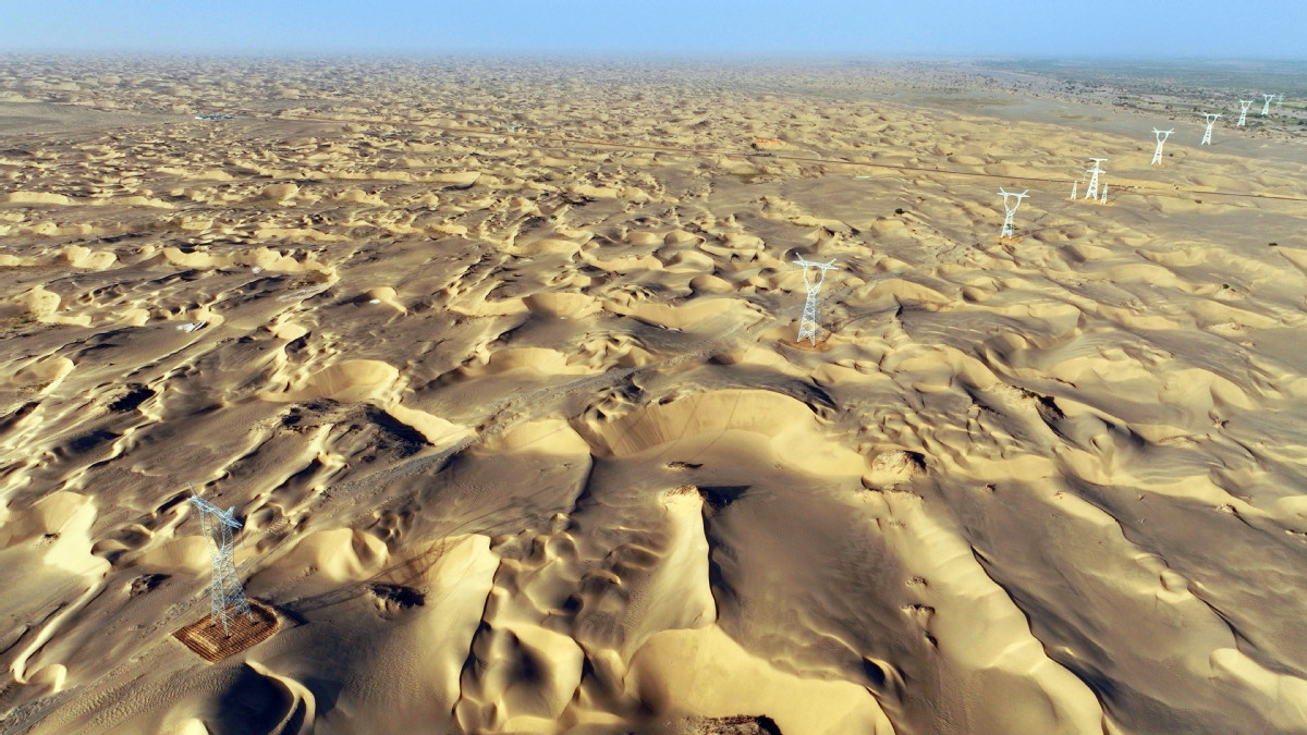 2025年6月25日,民豐—且末—若羌750千伏輸電線路工程穿越“死亡之?!彼死敻缮衬#R元 攝)