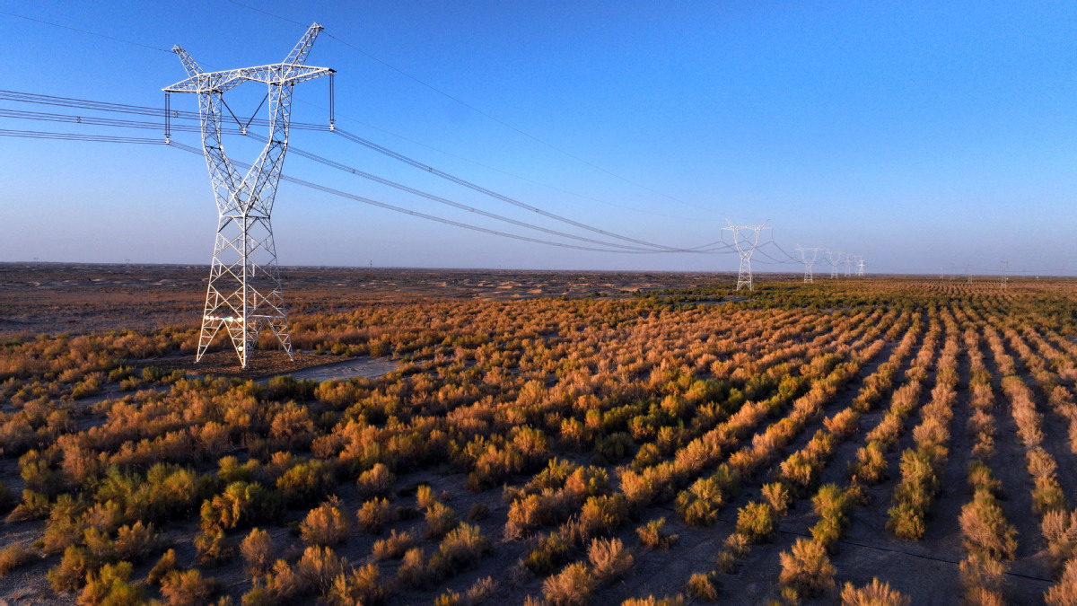 2025年10月18日,民豐—且末—若羌750千伏輸電線路工程與胡楊林和諧共處。(馬元 攝)