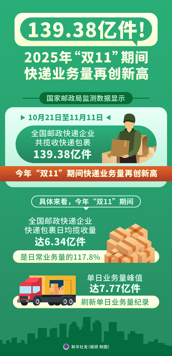 具體來看,今年“雙11”期間,全國郵政快遞企業(yè)快遞包裹日均攬收量達6.34億件,是日常業(yè)務(wù)量的117.8%;單日業(yè)務(wù)量峰值達7.77億件,刷新單日業(yè)務(wù)量紀(jì)錄。
