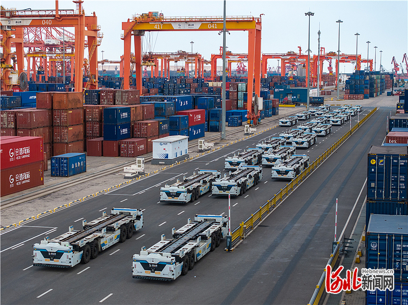 近日,唐山港京唐港區(qū),集裝箱碼頭堆場(chǎng)上智能平板運(yùn)輸車(chē)整裝待發(fā)。 河北日?qǐng)?bào)記者趙杰攝