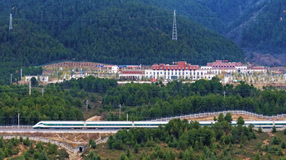 11月21日,一列動車組列車駛過云南迪慶藏族自治州小中甸站(無人機照片)。