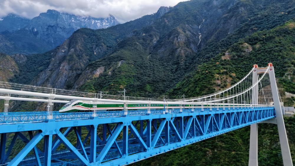 11月21日,動車組列車通過虎跳峽金沙江鐵路大橋(無人機照片)。