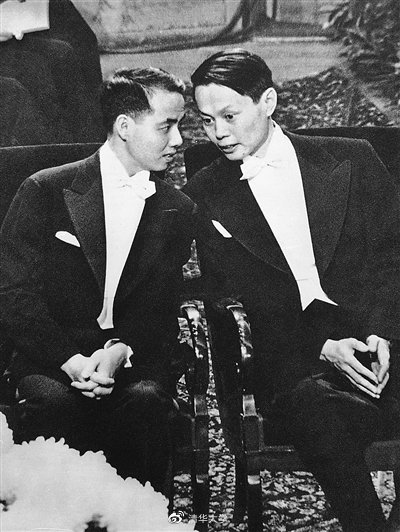 1957年瑞典斯德哥爾摩,諾貝爾物理學獎獲得者楊振寧和李政道。來源:清華大學官方微博