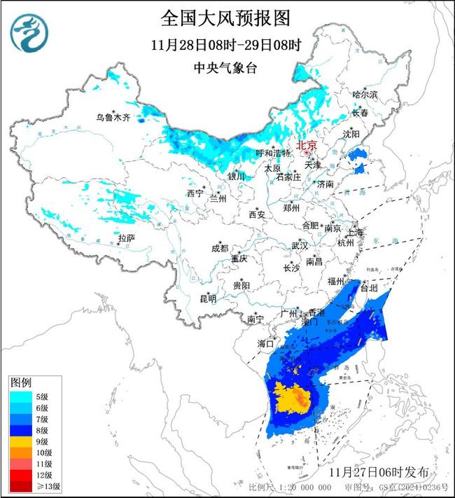 預(yù)計(jì),11月27日08時(shí)至28日08時(shí),新疆東部、內(nèi)蒙古中西部、甘肅西部、寧夏北部、山東半島、江蘇沿海以及青海西南部、西藏中西部等地有5~7級(jí)大風(fēng),陣風(fēng)8~9級(jí),其中新疆東部山口地區(qū)、內(nèi)蒙古西部部分地區(qū)風(fēng)力可達(dá)8級(jí),陣風(fēng)9~10級(jí);11月27日08時(shí)至28日08時(shí)臺(tái)灣海峽、巴士海峽、南海北部和中東部海域?qū)⒂?級(jí)、陣風(fēng)9級(jí)的東北風(fēng),其中南海中西部和西南部海域的風(fēng)力可達(dá)10級(jí)、陣風(fēng)11級(jí),南海中東部海域的風(fēng)力可達(dá)9級(jí)、陣風(fēng)10級(jí),南海東南部海域?qū)⒂?級(jí)、陣風(fēng)9級(jí)的東南風(fēng)。