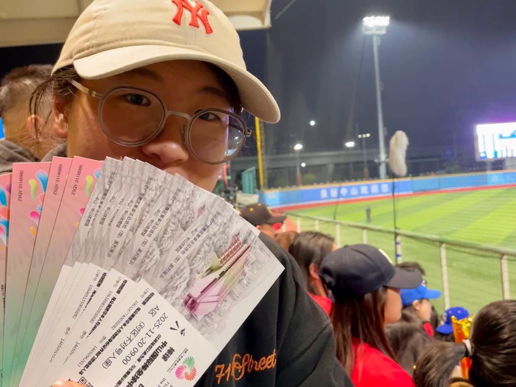 11月20日,一名觀眾在全運(yùn)會棒球比賽現(xiàn)場展示自己的票根。新華社記者霍思穎 攝