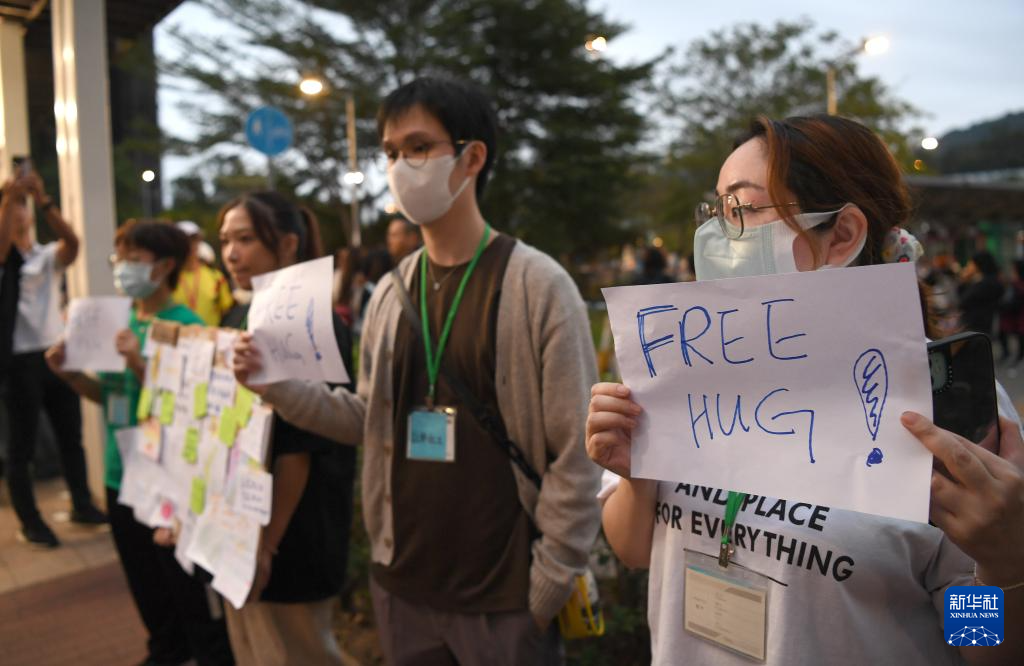 11月30日,義工在香港大埔廣福休憩處舉牌提供免費擁抱,提供心理疏導。新華社記者 陳鐸 攝