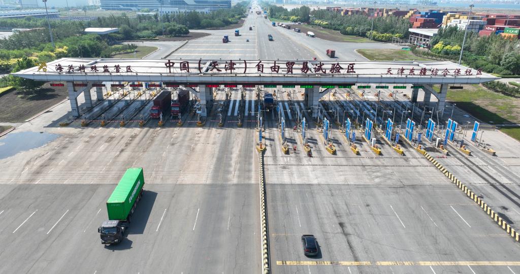 這是6月20日拍攝的天津自貿(mào)區(qū)天津港東疆片區(qū)入口處的中國(天津)自由貿(mào)易試驗(yàn)區(qū)海關(guān)特殊監(jiān)管區(qū)入口(無人機(jī)照片)。新華社記者 孫凡越 攝