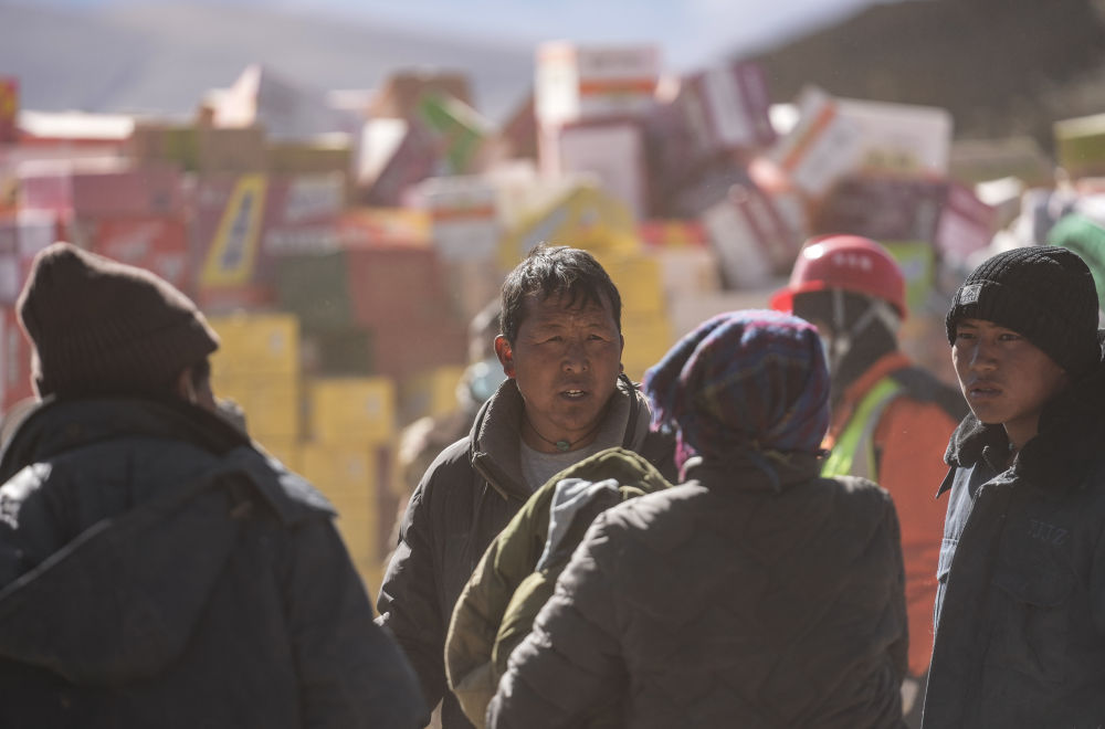 2025年1月10日,定日縣長所鄉(xiāng)古榮村黨支部書記次仁平措(中)協(xié)助群眾搬進板房。