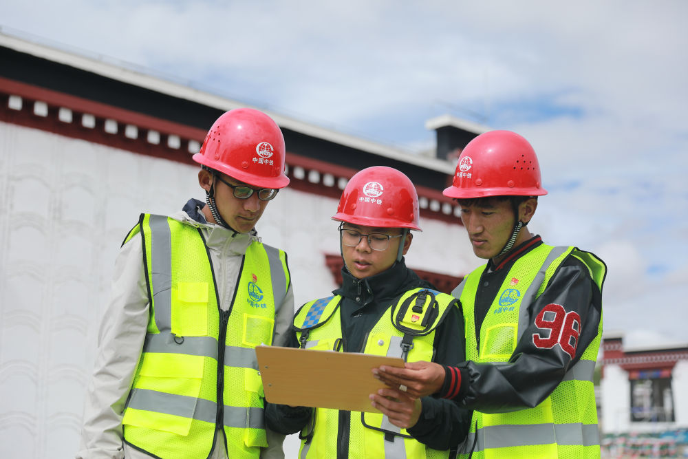 2025年8月10日,技術(shù)人員在中國中鐵定日縣曲洛鄉(xiāng)措昂村民房恢復重建項目施工現(xiàn)場商討方案。