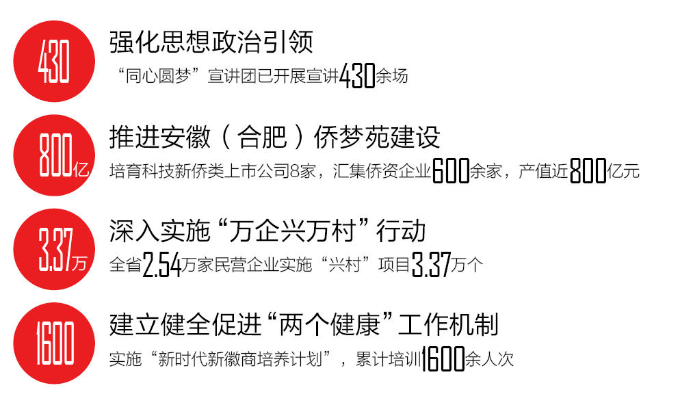 堅(jiān)持和落實(shí)“兩個(gè)毫不動搖”,建立健全促進(jìn)“兩個(gè)健康”工作機(jī)制。持續(xù)優(yōu)化民營經(jīng)濟(jì)發(fā)展環(huán)境,促進(jìn)經(jīng)濟(jì)社會高質(zhì)量發(fā)展。召開全省民營經(jīng)濟(jì)統(tǒng)戰(zhàn)工作會議,明確36項(xiàng)重點(diǎn)任務(wù)和55家責(zé)任單位,建立13家省直單位組成的聯(lián)席會議制度。聚焦凝心鑄魂,全省統(tǒng)戰(zhàn)系統(tǒng)累計(jì)開展理想信念教育和經(jīng)濟(jì)形勢政策教育808場次,覆蓋3.82萬人次民營經(jīng)濟(jì)人士。突出年輕一代培育,實(shí)施“新時(shí)代新徽商培養(yǎng)計(jì)劃”,累計(jì)培訓(xùn)1600余人次,建立約2500人的代表人士數(shù)據(jù)庫,推動青年商會組織省市全覆蓋,推薦4300余名優(yōu)秀青年企業(yè)家進(jìn)入各級人大、政協(xié)。引導(dǎo)企業(yè)履行社會責(zé)任,完成光彩事業(yè)發(fā)起實(shí)施30周年相關(guān)調(diào)研及先進(jìn)典型推薦宣傳工作。