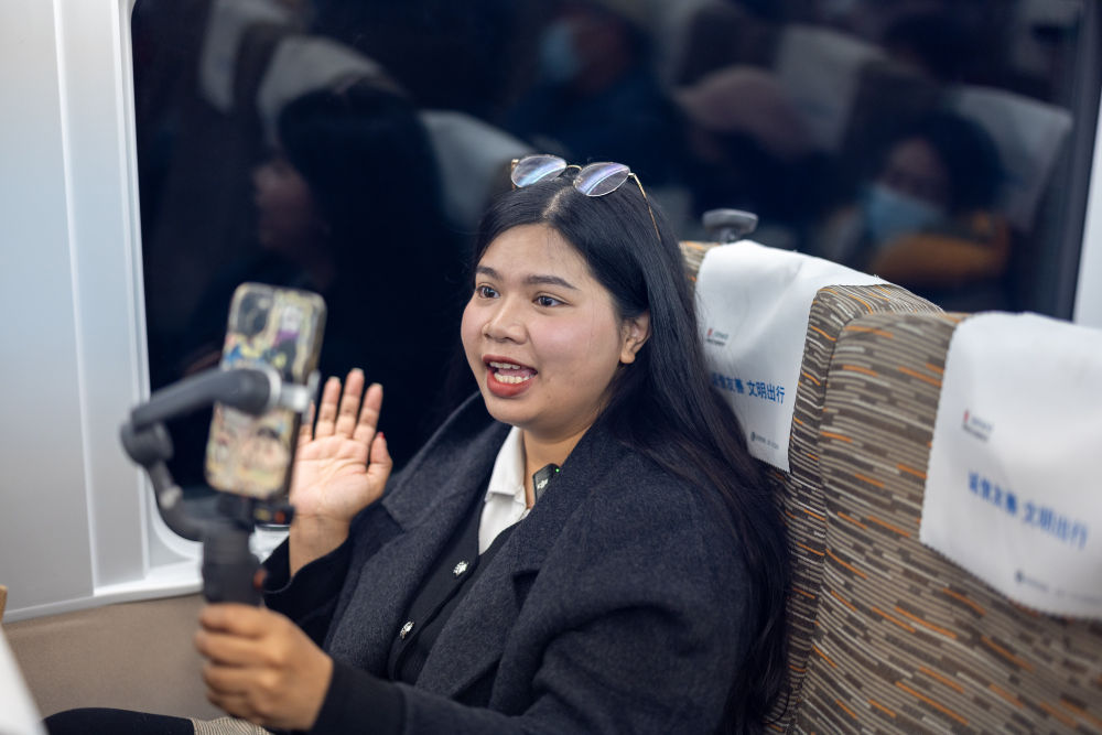 2025年2月21日,泰國博主李佩英在中國拍攝體驗復(fù)興號高鐵列車。新華社記者 黃偉 攝