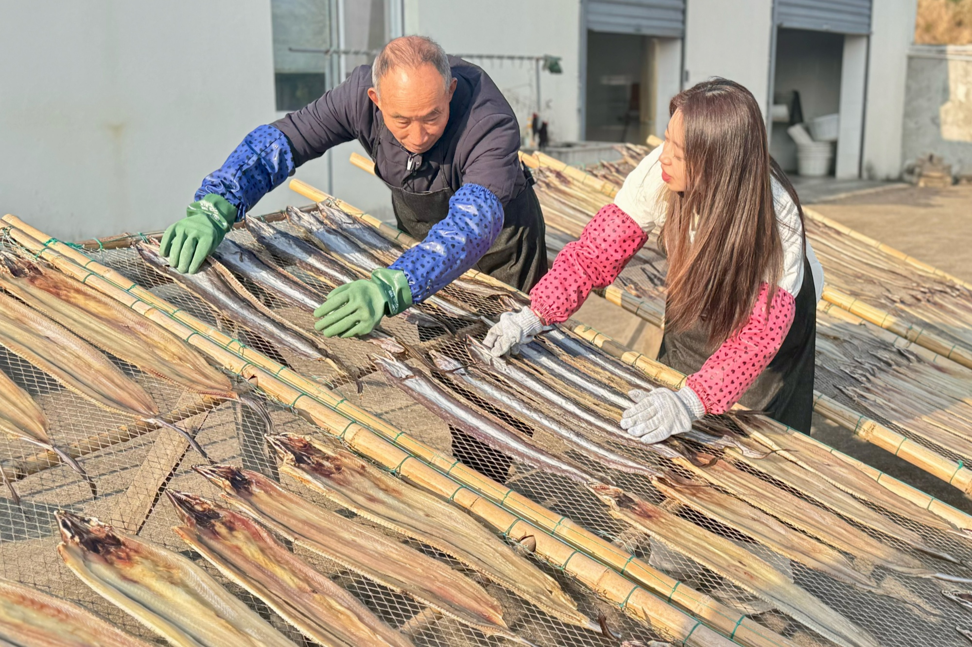 曬魚(yú)鲞是海島群眾的傳統(tǒng)習(xí)俗。近日,在當(dāng)?shù)剡h(yuǎn)近聞名的魚(yú)鲞專(zhuān)業(yè)村——茅洋鄉(xiāng)文洋村的文山一品魚(yú)鲞廠里,工人們正趁著晴好天氣忙著翻曬魚(yú)鲞,空氣中彌漫著咸鮮的海風(fēng)氣息。選鮮、處理、腌制、晾曬的傳統(tǒng)工序與現(xiàn)代化流水線并行運(yùn)轉(zhuǎn),廠長(zhǎng)鮑財(cái)富一邊指導(dǎo)工人包裝,一邊向記者介紹:“我從事這行已經(jīng)30余年了,多的時(shí)候日產(chǎn)量能有一二千斤,一般都是批量賣(mài)給飯店?!?/p>