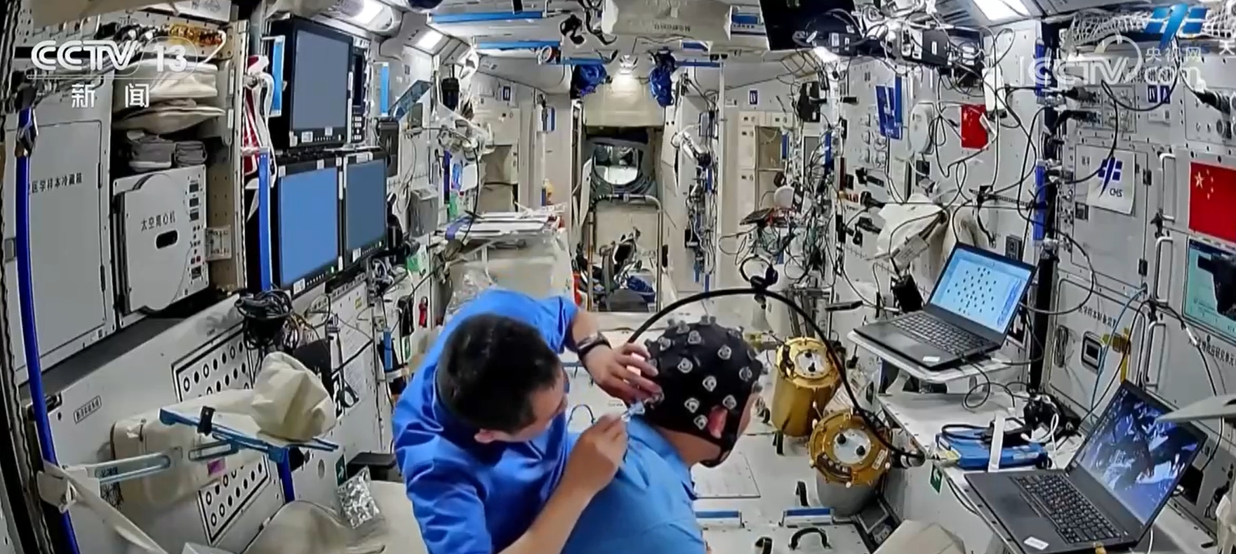 在軌腦電測(cè)試研究相關(guān)項(xiàng)目按計(jì)劃開展,乘組利用腦電設(shè)備完成了上下視野研究、執(zhí)行功能訓(xùn)練、探索利用研究等多個(gè)項(xiàng)目的實(shí)驗(yàn)測(cè)試工作;使用近紅外腦功能成像設(shè)備開展空間腦網(wǎng)絡(luò)時(shí)變特性實(shí)驗(yàn),通過采集相關(guān)數(shù)據(jù),開展長期空間飛行環(huán)境對(duì)航天員腦功能網(wǎng)絡(luò)影響及大腦對(duì)外部環(huán)境變化進(jìn)行了自發(fā)調(diào)整與適應(yīng)機(jī)制研究。
