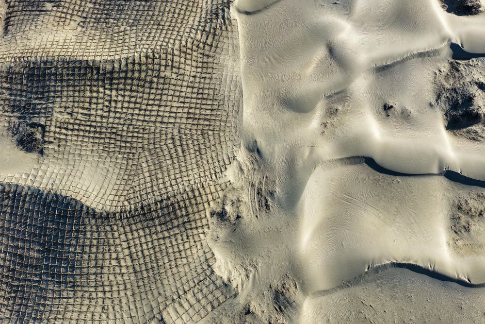 這是在新疆和田地區(qū)墨玉縣喀瓦克鄉(xiāng)周邊沙漠拍攝的草方格(1月11日攝,無人機照片)。新華社記者 丁磊 攝