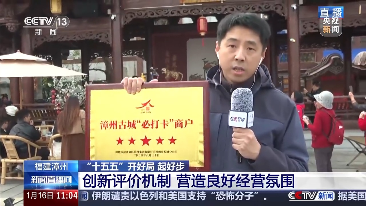 此外,我們還注意到一個細(xì)節(jié)。這里有一些商家,獲得了這樣一種帶有星級評價的獎牌。這是漳州古城聯(lián)合了當(dāng)?shù)匚穆?、商?wù)、市場監(jiān)管等部門共同授予。目前,當(dāng)?shù)叵嚓P(guān)部門每兩年都會對古城內(nèi)的商戶開展文明誠信經(jīng)營示范評選,經(jīng)過線上投票、現(xiàn)場考察、線下評分等環(huán)節(jié),上榜單位將得到漳州當(dāng)?shù)赜杏绊懥Φ墓娞?、視頻號等的推廣支持,不僅讓精品商鋪能夠出圈,提升古城的游客流量,也激勵其他商戶,來共同營造良好的經(jīng)營氛圍。