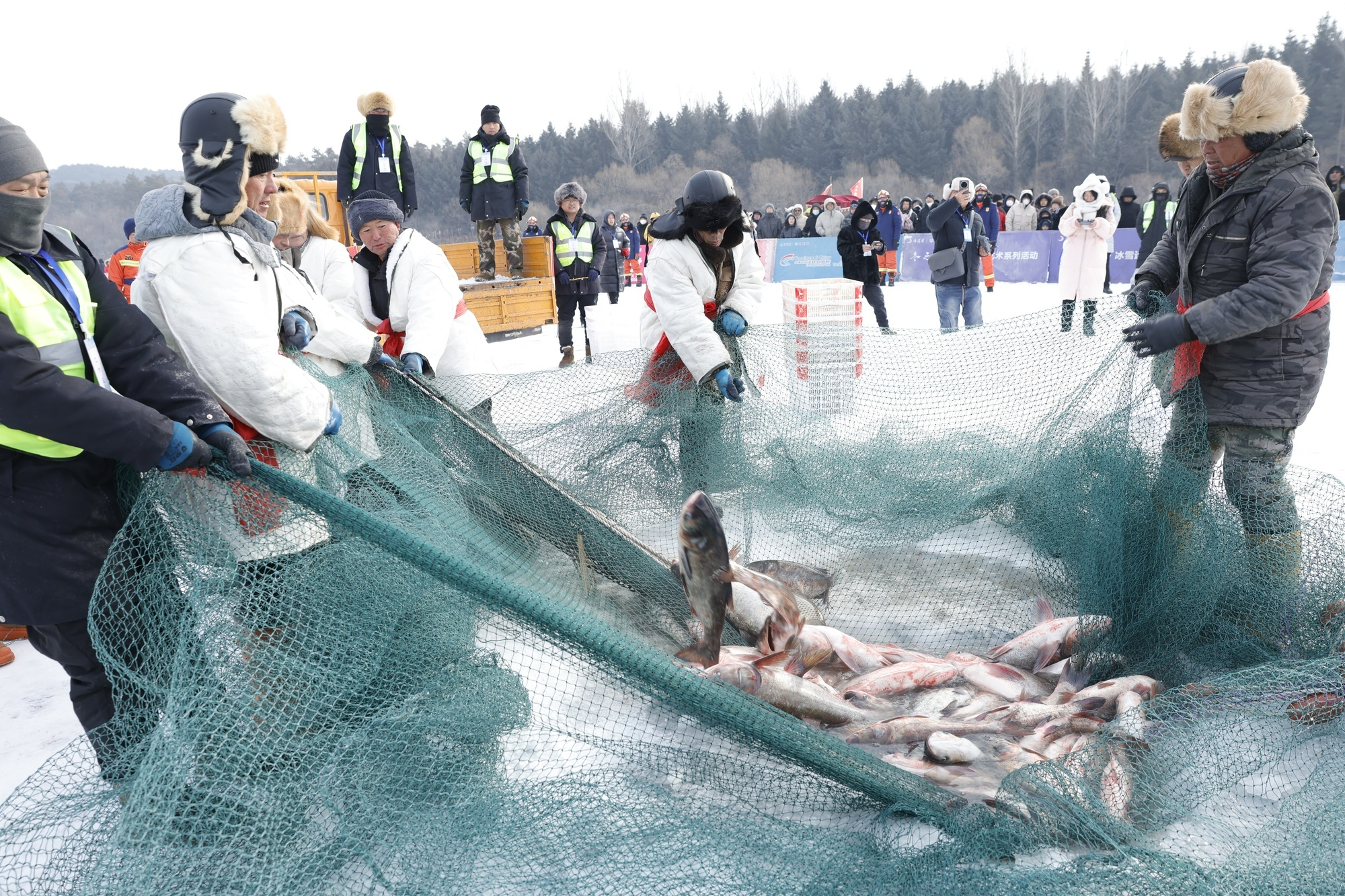 伴隨著“魚(yú)把頭”一聲令下,數(shù)萬(wàn)條活魚(yú)躍出水面,“冰湖騰魚(yú)”的盛景瞬間點(diǎn)燃寒冬。