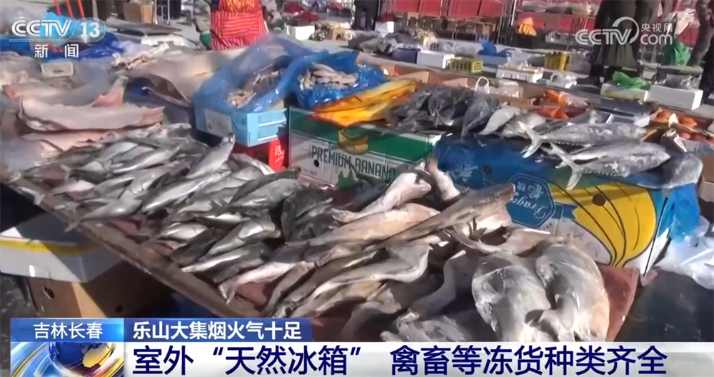 接著往里走,這里就是東北特色十足的生鮮凍貨區(qū)了。長(zhǎng)春的冬天,室外零下20多攝氏度,堪稱(chēng)“天然大冰箱”。您看這凍魚(yú)、凍豆包凍得老硬了,還有凍梨、凍柿子,都是東北人節(jié)慶團(tuán)圓必備的滋味,化透之后一口咬下去滿是汁水,清甜可口。