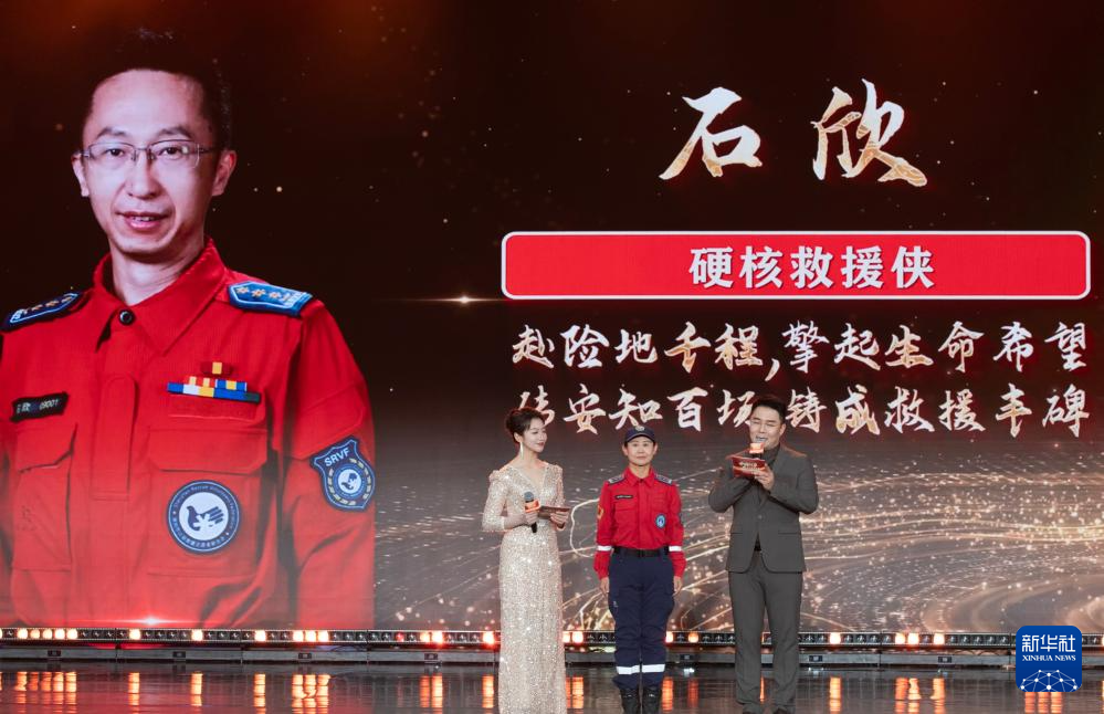 1月28日,由新華社主辦的“中國網(wǎng)事·感動2025”公益盛典暨年度頒獎典禮在北京舉行,活動揭曉“中國網(wǎng)事·感動2025”十大年度網(wǎng)絡(luò)人物。這是“硬核救援俠”石欣的代表(中)出席頒獎典禮。新華社記者 李安 攝