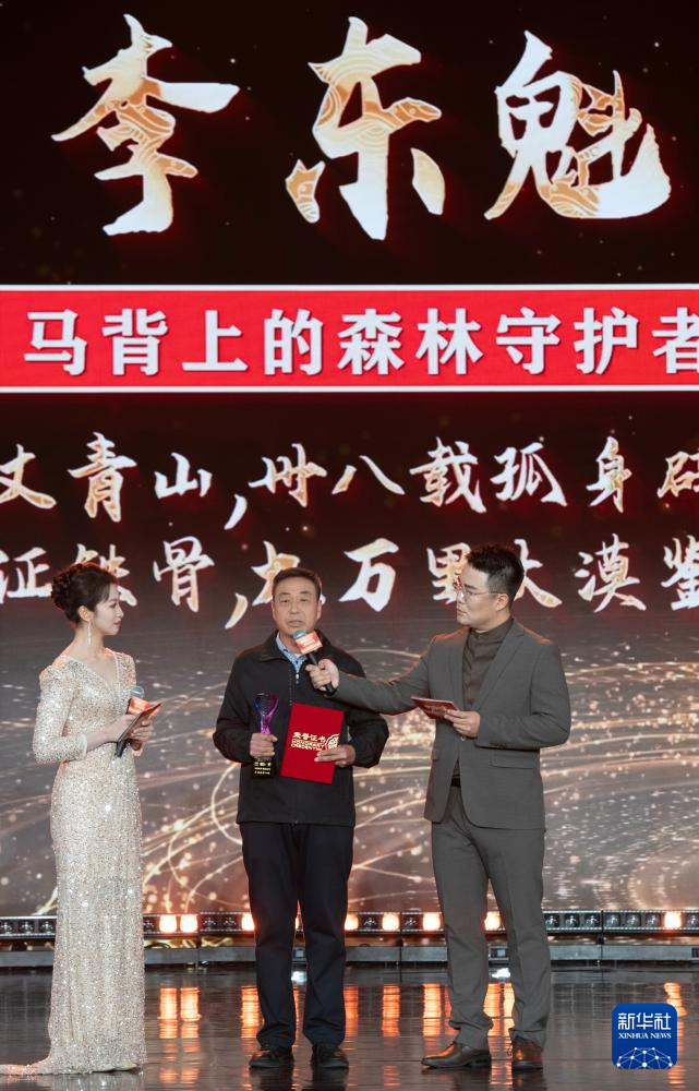 1月28日,由新華社主辦的“中國網(wǎng)事·感動2025”公益盛典暨年度頒獎典禮在北京舉行,活動揭曉“中國網(wǎng)事·感動2025”十大年度網(wǎng)絡(luò)人物。這是“馬背上的森林守護者”李東魁(中)出席頒獎典禮。新華社記者 李安 攝