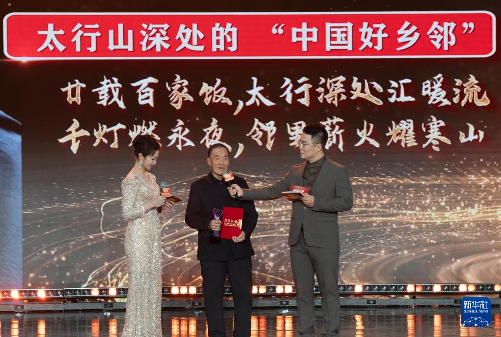 1月28日,由新華社主辦的“中國網(wǎng)事·感動2025”公益盛典暨年度頒獎典禮在北京舉行,活動揭曉“中國網(wǎng)事·感動2025”十大年度網(wǎng)絡(luò)人物。這是“太行山深處的‘中國好鄉(xiāng)鄰’”黃崖溝村村民代表(中)出席頒獎典禮。新華社記者 李安 攝