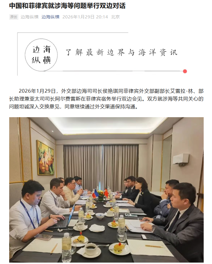 2026年1月29日,外交部邊海司司長侯艷琪同菲律賓外交部副部長艾雷拉-林、部長助理兼亞太司司長阿爾費雷斯在菲律賓宿務(wù)舉行雙邊會見。雙方就涉海等共同關(guān)心的問題坦誠深入交換意見,同意繼續(xù)通過外交渠道保持溝通。
