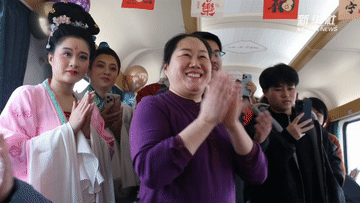 車廂里,國家級(jí)非遺沾化漁鼓戲現(xiàn)場開唱。旅客們都圍攏過來,在回家的路上聽了一段地道年戲。