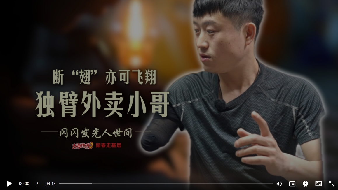 18歲意外失去右臂,不向命運(yùn)低頭,單手騎車(chē)、送餐、爬樓,憑著樂(lè)觀和韌勁,風(fēng)雨無(wú)阻跑遍阜新街巷。每天工作12小時(shí)、日均配送60單、爬樓100多層、騎行100多公里……