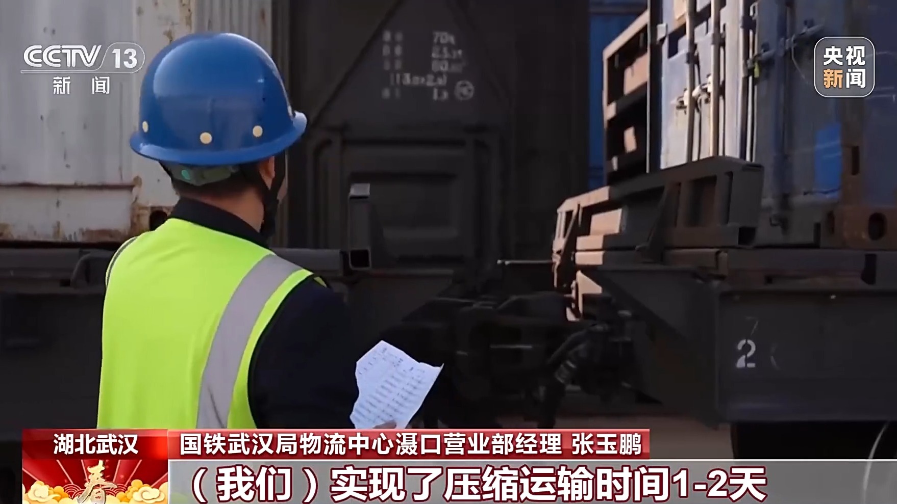 國鐵武漢局物流中心灄口營業(yè)部經(jīng)理 張玉鵬:現(xiàn)在貨量明顯上來了,很多企業(yè)開年第一批貨都集中在這幾天發(fā)運(yùn),每天發(fā)到3列左右。通過前置查驗(yàn)、集拼集運(yùn)、雙始發(fā)站聯(lián)動,我們實(shí)現(xiàn)了壓縮運(yùn)輸時間1-2天、降低物流成本15%。