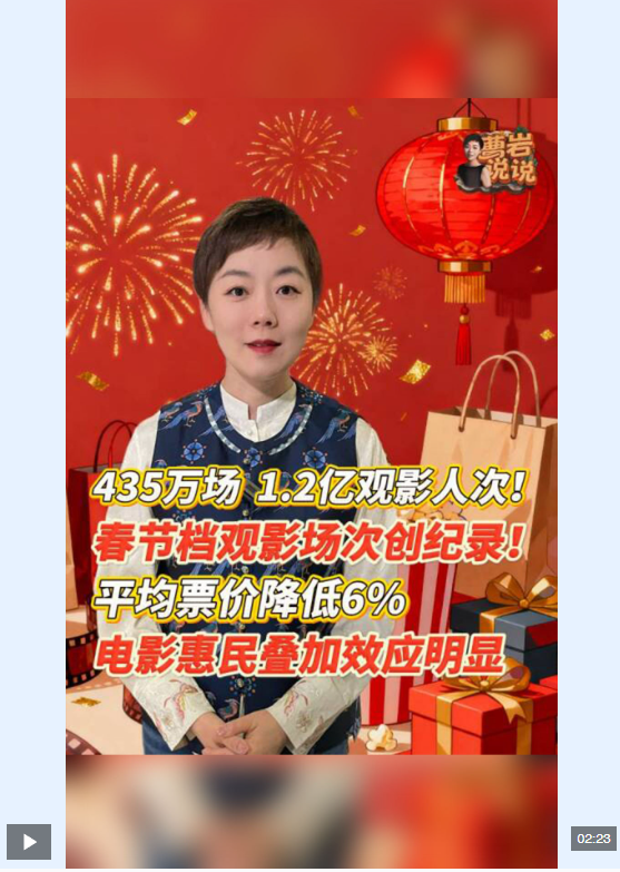 2026馬年春節(jié)檔圓滿收官,精彩表現(xiàn)彰顯了文化惠民實效與市場的強勁活力。從充足供給、親民票價到下沉市場發(fā)力,電影產(chǎn)業(yè)以惠民政策為抓手,聯(lián)動多方釋放消費潛力,帶動多元業(yè)態(tài)融合發(fā)展。中國電影穩(wěn)步邁向高質(zhì)量發(fā)展,持續(xù)為群眾美好生活添彩,為文化繁榮與經(jīng)濟增長注入新動能?! ?/p>