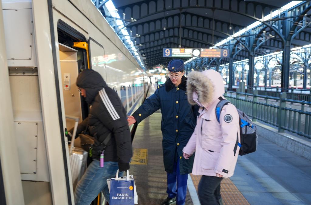 中國鐵路哈爾濱局集團有限公司工作人員(中)在哈爾濱火車站為旅客服務(wù)。李昕洋 攝