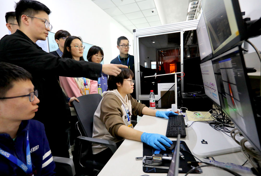 2024年4月6日,在位于安徽合肥的中國科學技術大學,安徽省先進功能高分子薄膜工程實驗室團隊成員在檢修自主研制的高分子薄膜原位雙向拉伸實驗設備的電氣控制系統(tǒng)。