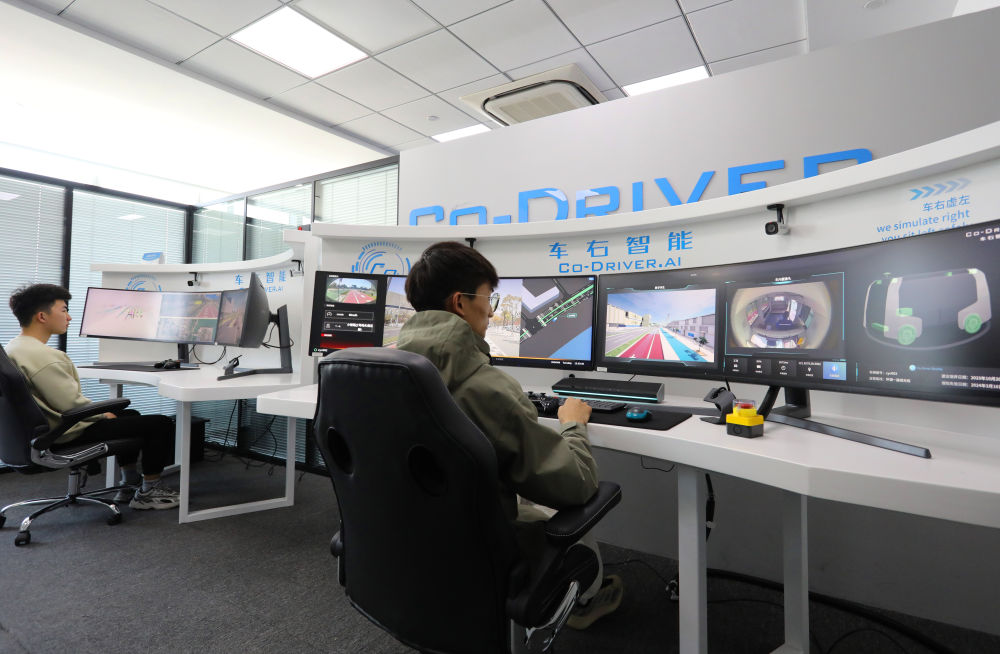 在位于中國(guó)(上海)自由貿(mào)易試驗(yàn)區(qū)臨港新片區(qū)的一家智能駕駛企業(yè),工作人員通過(guò)無(wú)人駕駛汽車(chē)遠(yuǎn)程監(jiān)管平臺(tái)的實(shí)時(shí)畫(huà)面,結(jié)合電子地圖對(duì)在自動(dòng)駕駛測(cè)試專用路上行駛的車(chē)輛進(jìn)行監(jiān)管(2024年4月9日攝)。